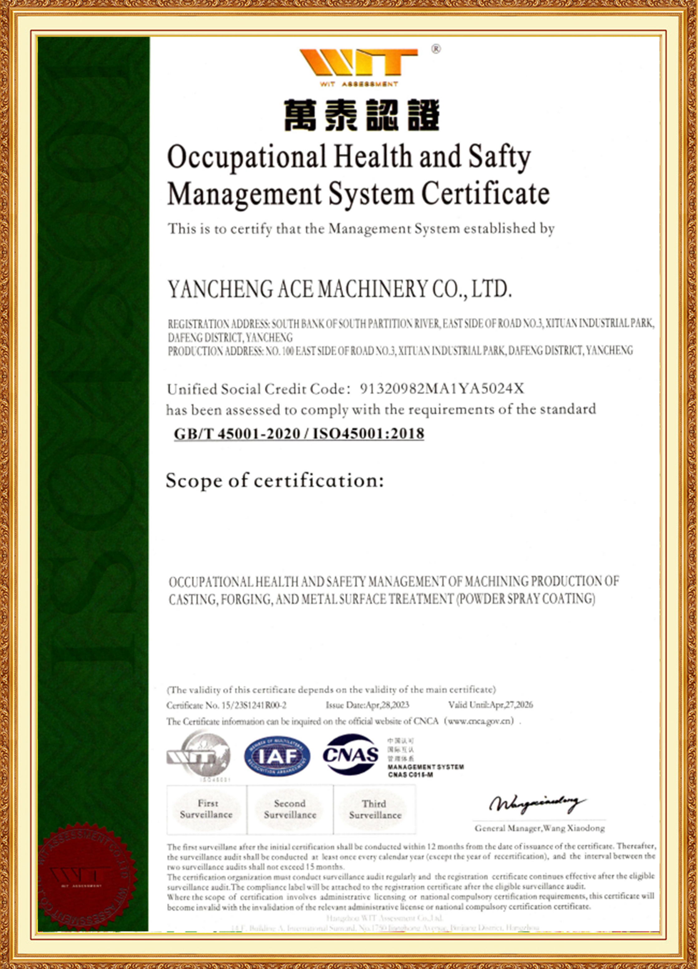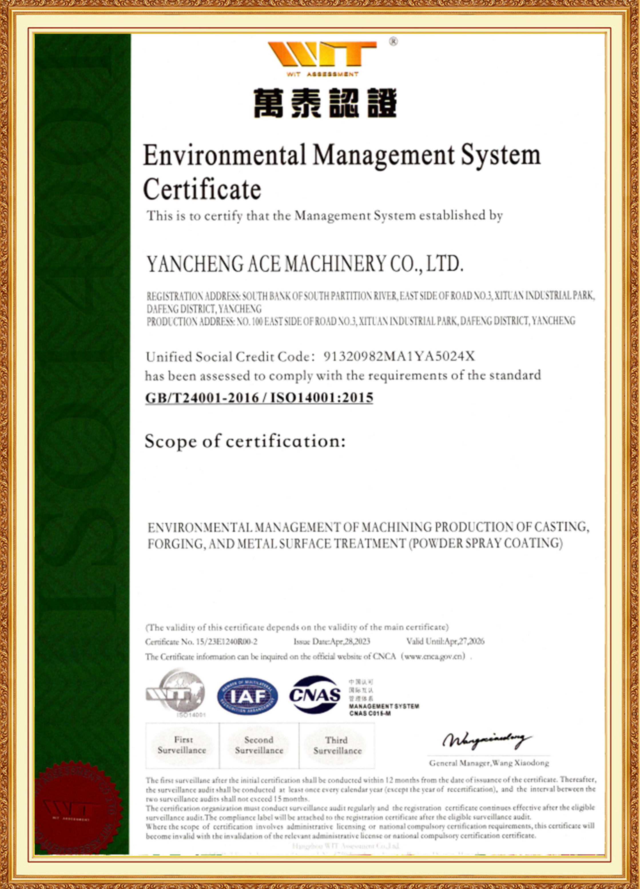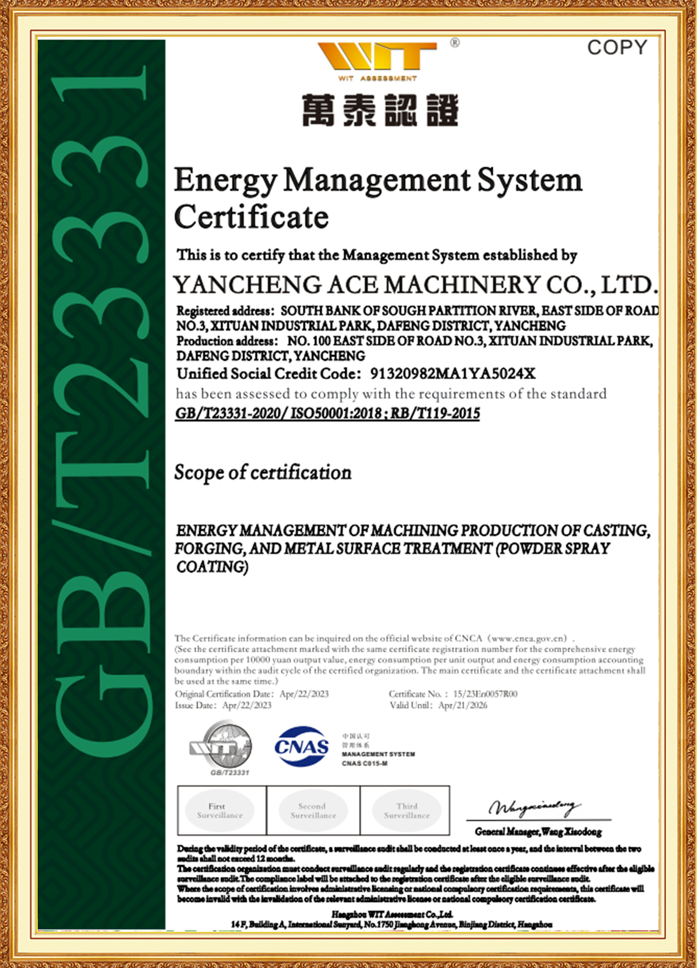 Grupo ACE é apoiada por uma equipe de gestão composta por jovens membros importantes com experiência nas indústrias de materiais, tratamento térmico, usinagem e tratamento de superfície. Eles são bem versados em padrões nacionais e internacionais, pioneiros e comprometidos com a inovação. A subsidiária ACE Machinery obteve a certificação do Sistema de Gestão de Qualidade ISO 9001 da TÜV Rheinland, bem como as certificações de sistema ISO 14001, 45001 e 50001. É reconhecida como uma empresa especializada, refinada, única e inovadora, uma empresa nacional de alta tecnologia e possui uma classificação de crédito empresarial de nível 3A.
